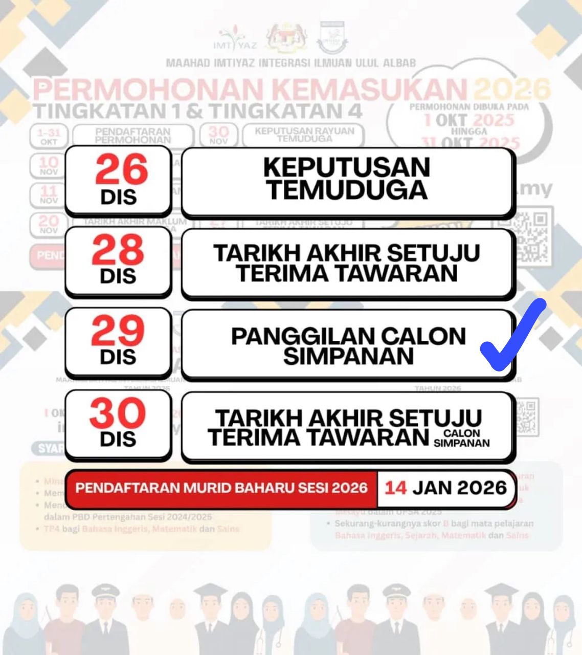 Tahniah. Anda telah lulus Sesi Temuduga dan ditawarkan tempat ke Maahad Imtiyaz bagi pengambilan tahun 2026. Pengesahan penerimaan tawaran adalah melalui bayaran RM250 sebagai sumbangan bulanan Januari 2026. Maklumat lanjut dilampirkan bersama Surat Tawaran Penempatan setelah pengesahan dilakukan.